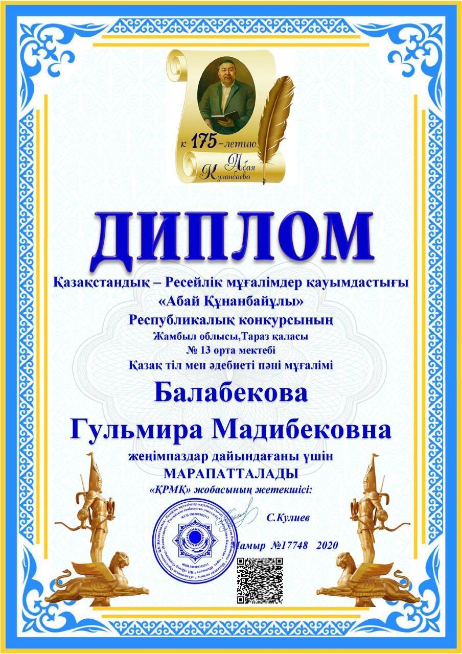 Қазақстандық -Ресейлік мұғалімдер қауымдастығы "Абай Құнанбайұлы" Республикалық конкурсның жеңімпаздары: Аксимбаева Дариға-1 орын иегері. Бекташвили Лалия-1 орын иегері.Мирзажанова муслима -1 орын иегерлерін шын жүректен құттықтаймыз!!! Жетекшісі: Балабекова Гульмира Мадибековна