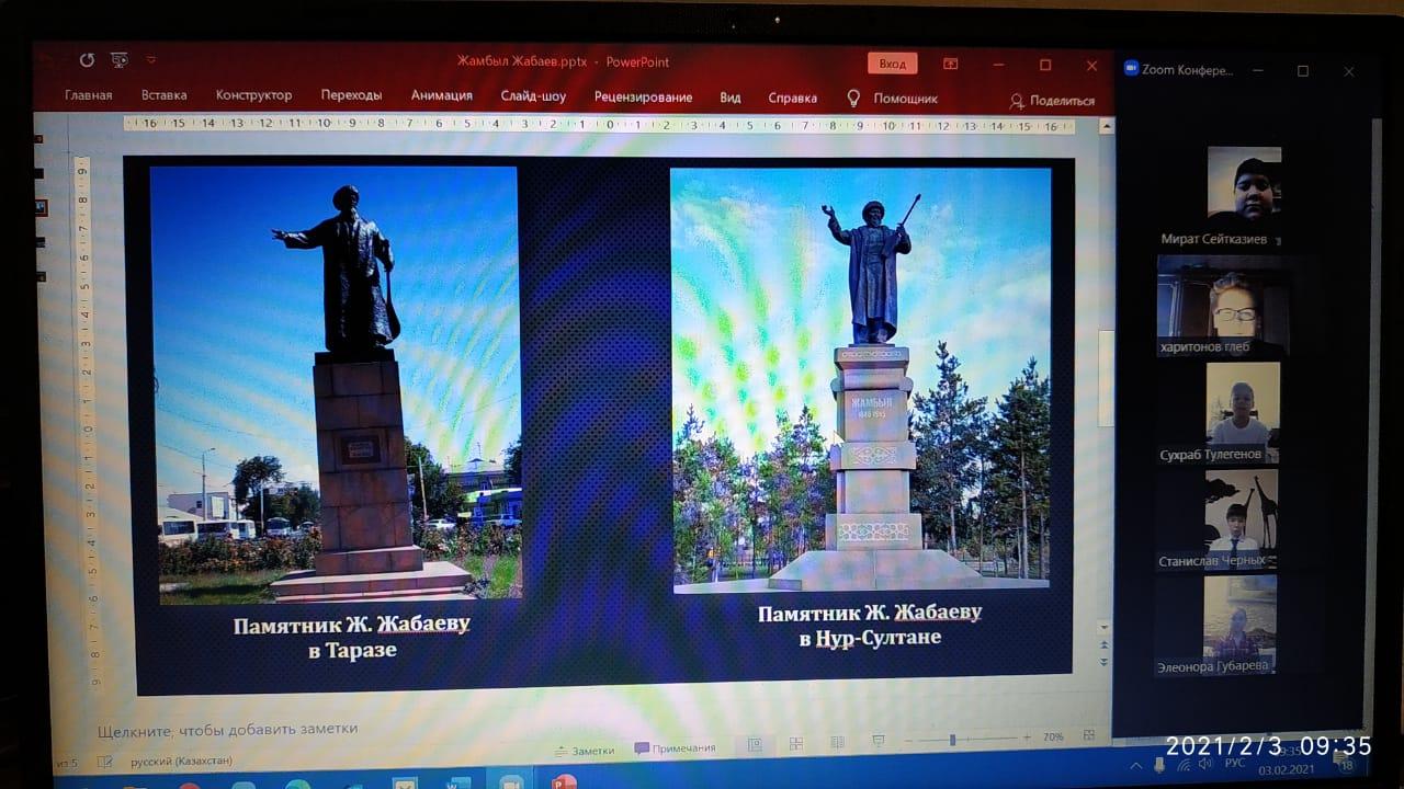 В 5 «Б» классе был проведен классный час «Жамбыл Жабаев – великий акын казахской степи», посвященный 175-летию великого поэта.Цель мероприятия — изучение вклада выдающегося народного акына, поэта-импровизатора казахского народа Жамбыла Жабаева в мировую литературу и культуру; обсуждение и пропаганда поэтической, общественной деятельности и наследия, изучение аспектов жизни и творчества Жамбыла Жабаева; привлечение молодежи в исследовательскую деятельность, развитие научного самосознания молодого поколения.