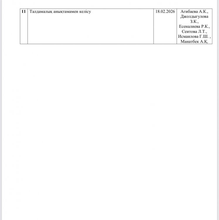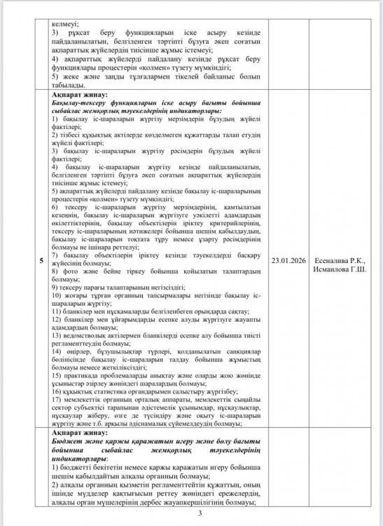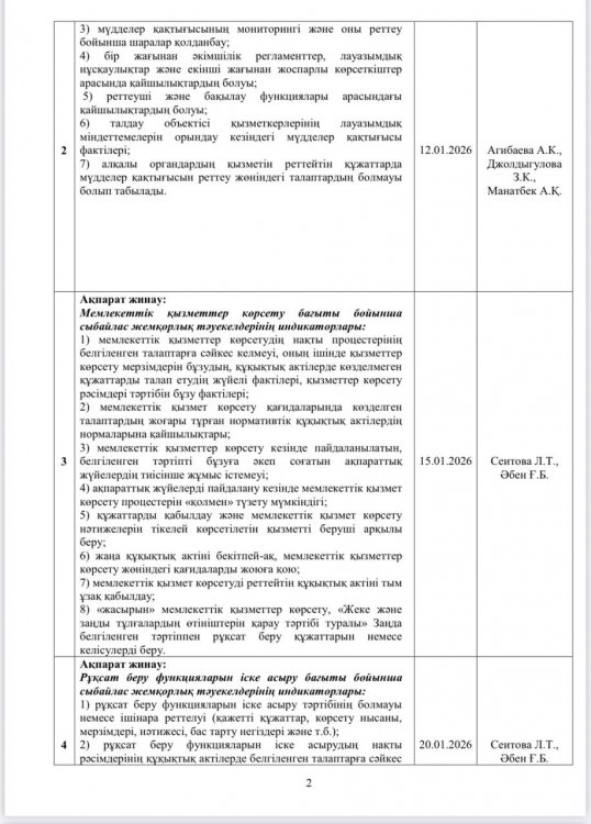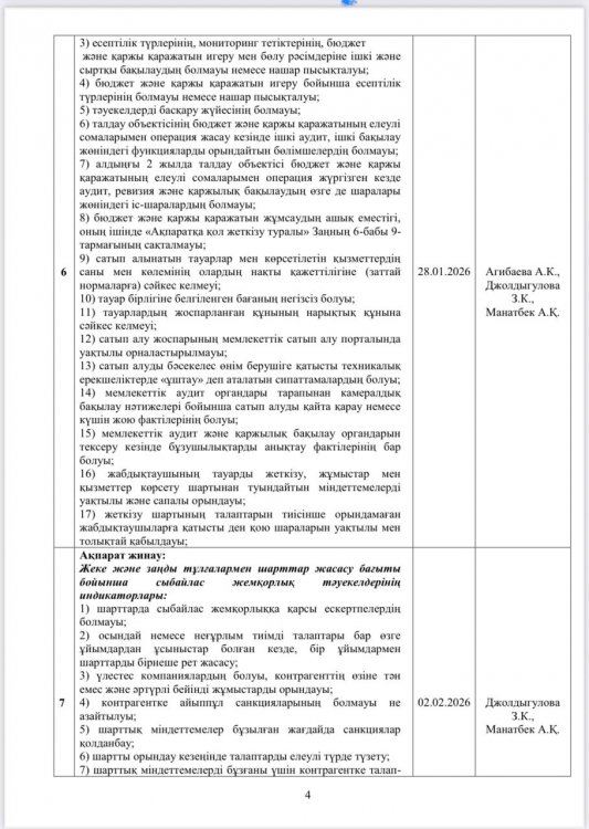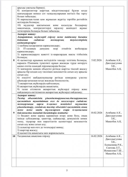 27 ақпан 2026 0 1 2 3 4 5 Сыбайлас жемқорлық тәуелкелдеріне ішкі талдау жүргізу жөніндегі жұмыс жоспары