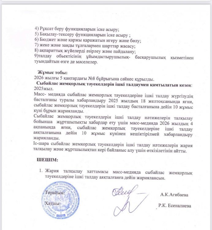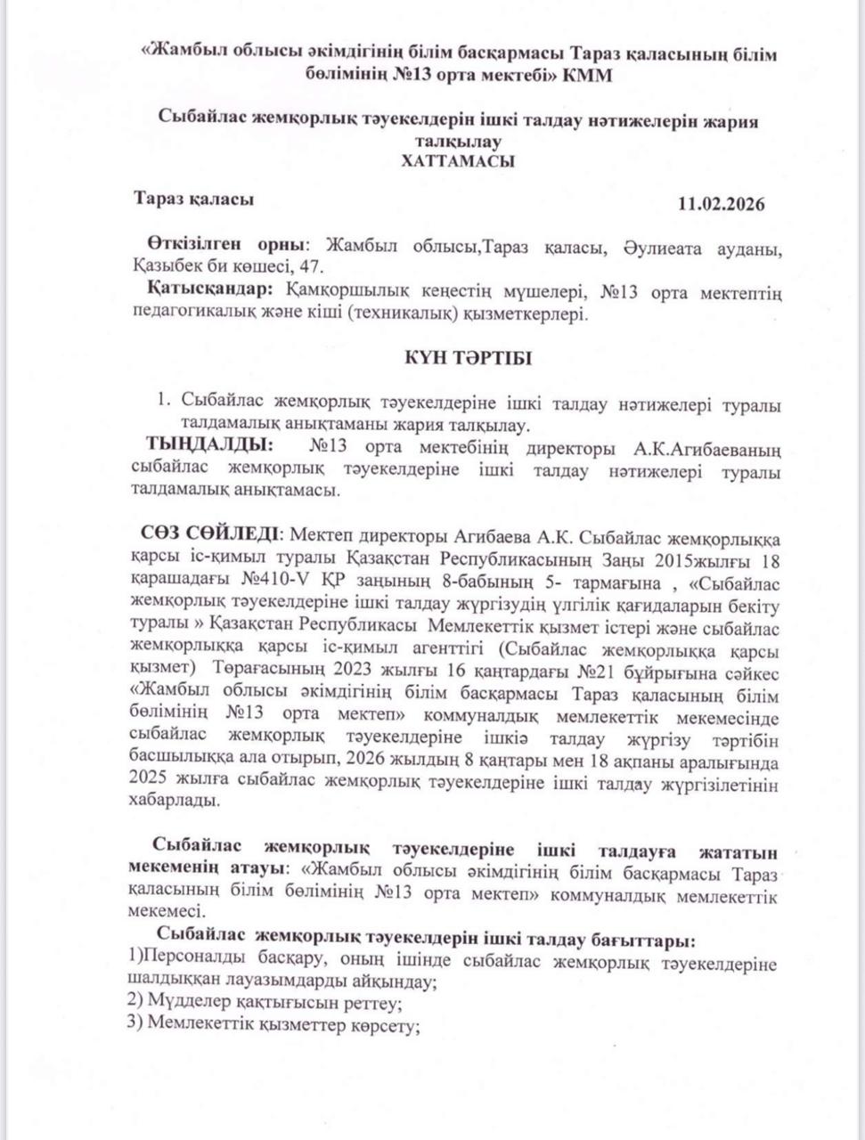 28 ақпан 2026 0 1 2 3 4 5 Сыбайлас жемқорлық тәуекелдерін ішкі талдау нәтижелерін жария талқылау хаттамасы